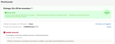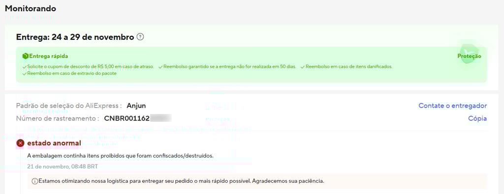 Seus direitos: Como reverter o prejuízo financeiro Apesar do cenário desanimador, o Código de Defesa do Consumidor e as próprias regras de proteção da plataforma estão ao lado do cliente. Na imagem, é possível ver o selo de "Proteção" e a promessa de "Reembolso garantido". A orientação jurídica clara é: não espere "a logística ser otimizada", como sugere a mensagem automática. Se o produto foi confiscado e destruído, a entrega tornou-se impossível. O consumidor deve tirar um "print" da tela de rastreamento (como a imagem acima) e abrir uma disputa imediatamente solicitando o reembolso integral por falha na entrega. A responsabilidade de garantir que o produto vendido pode entrar no país de destino é solidária entre o vendedor e a plataforma. O consumidor brasileiro não pode arcar com o prejuízo de uma mercadoria que sequer chegou às suas mãos.